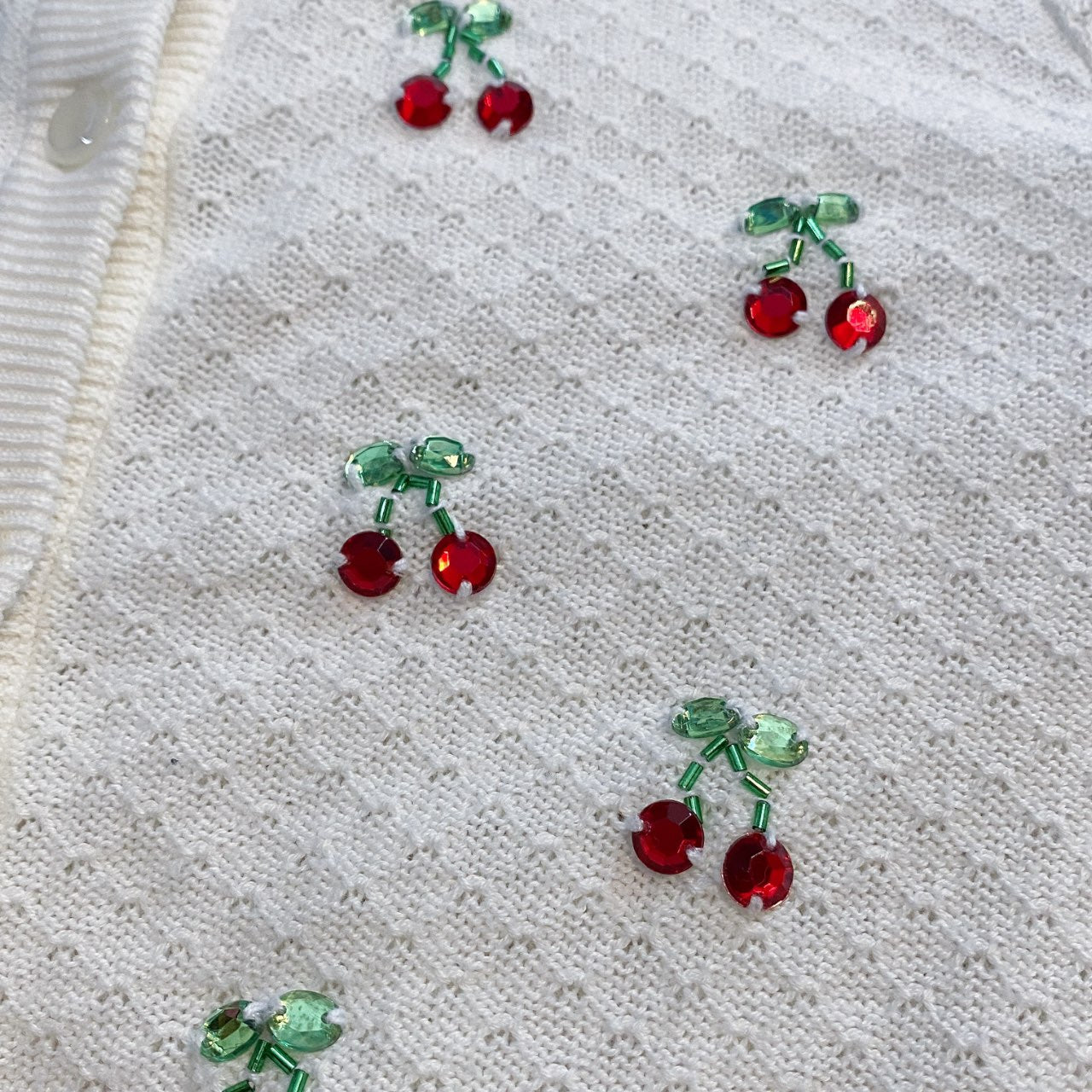 ♡ so super precious and rare Mezzo Piano cardigan ฅ^•ﻌ•^ฅ features extra soft and stretchy fabric with bling cherries all over the front, pretty pearlescent buttons, and logo embroidery detail 🌸🎀